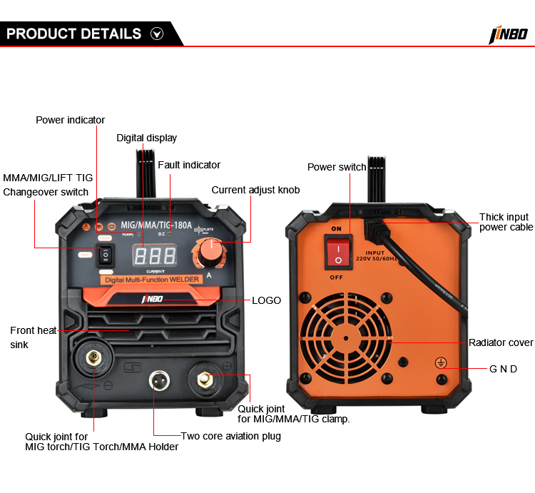 JINBO 220V multifunctional CO2 gas airless welding machine 1kg MMA MIG wire lifting TIG welding machine MIG DC welding machine for carbon steel